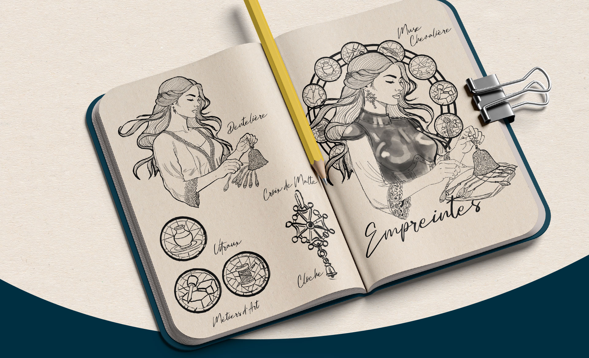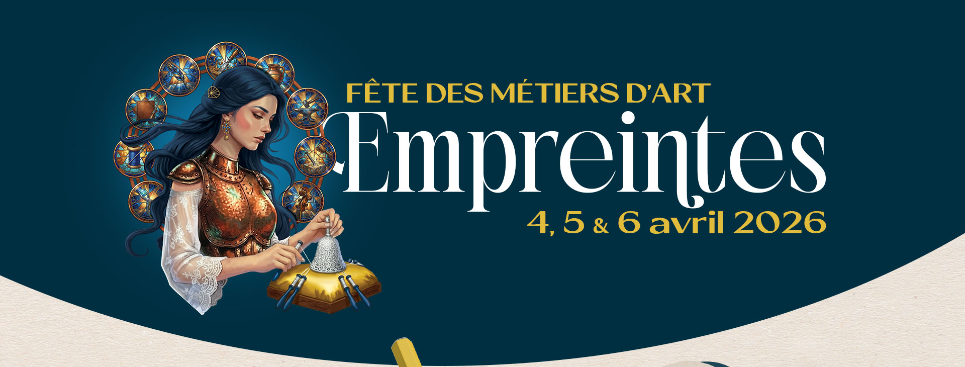 J’ai imaginé une illustration événementielle incarnée par un personnage allégorique représentant les métiers d’art. Cette figure symbolise à la fois la transmission des savoir-faire et leur ancrage dans le présent.