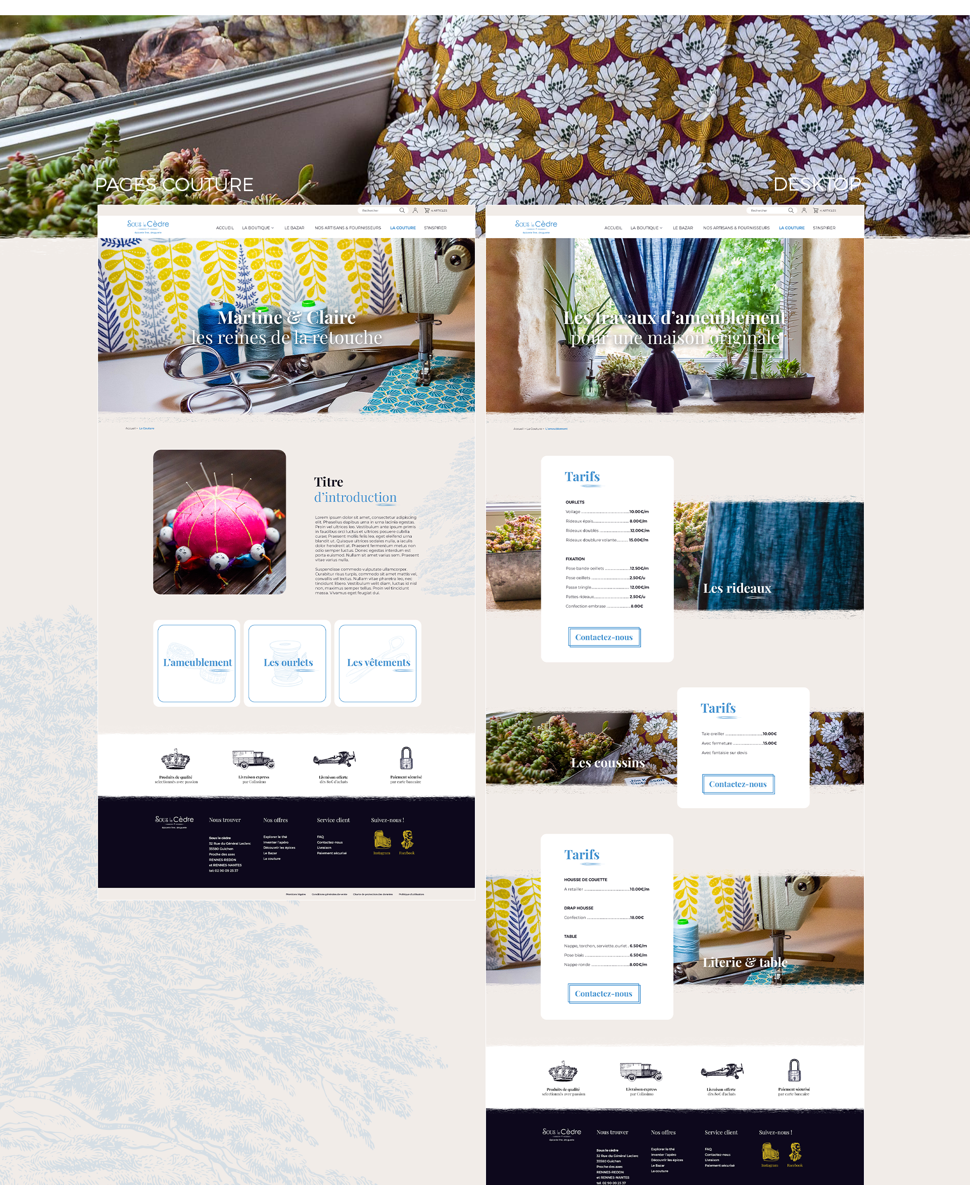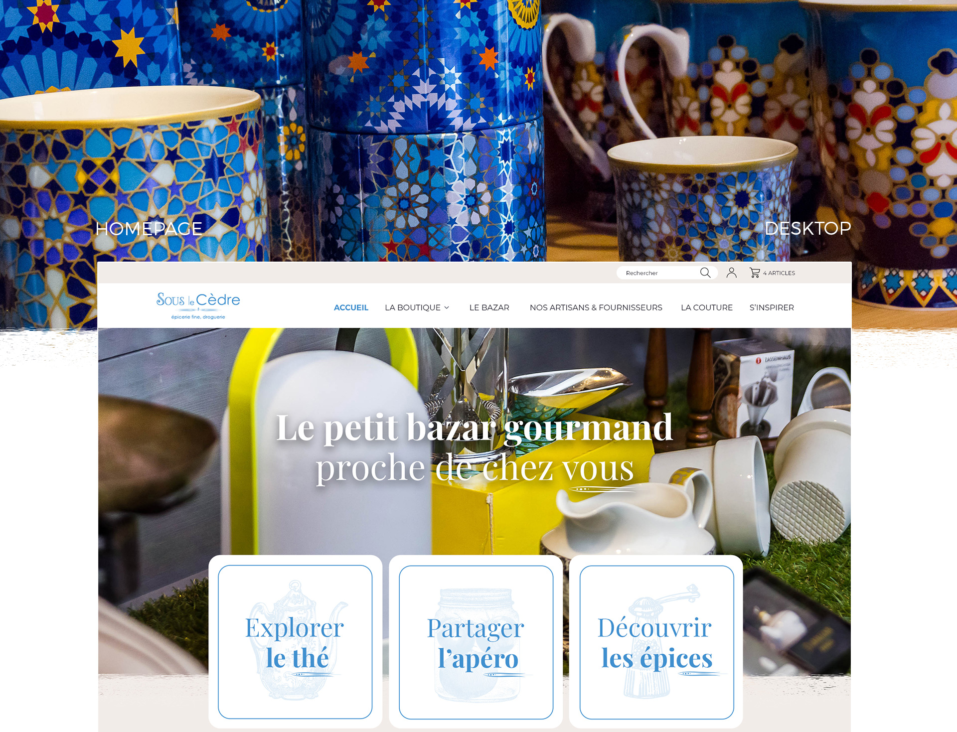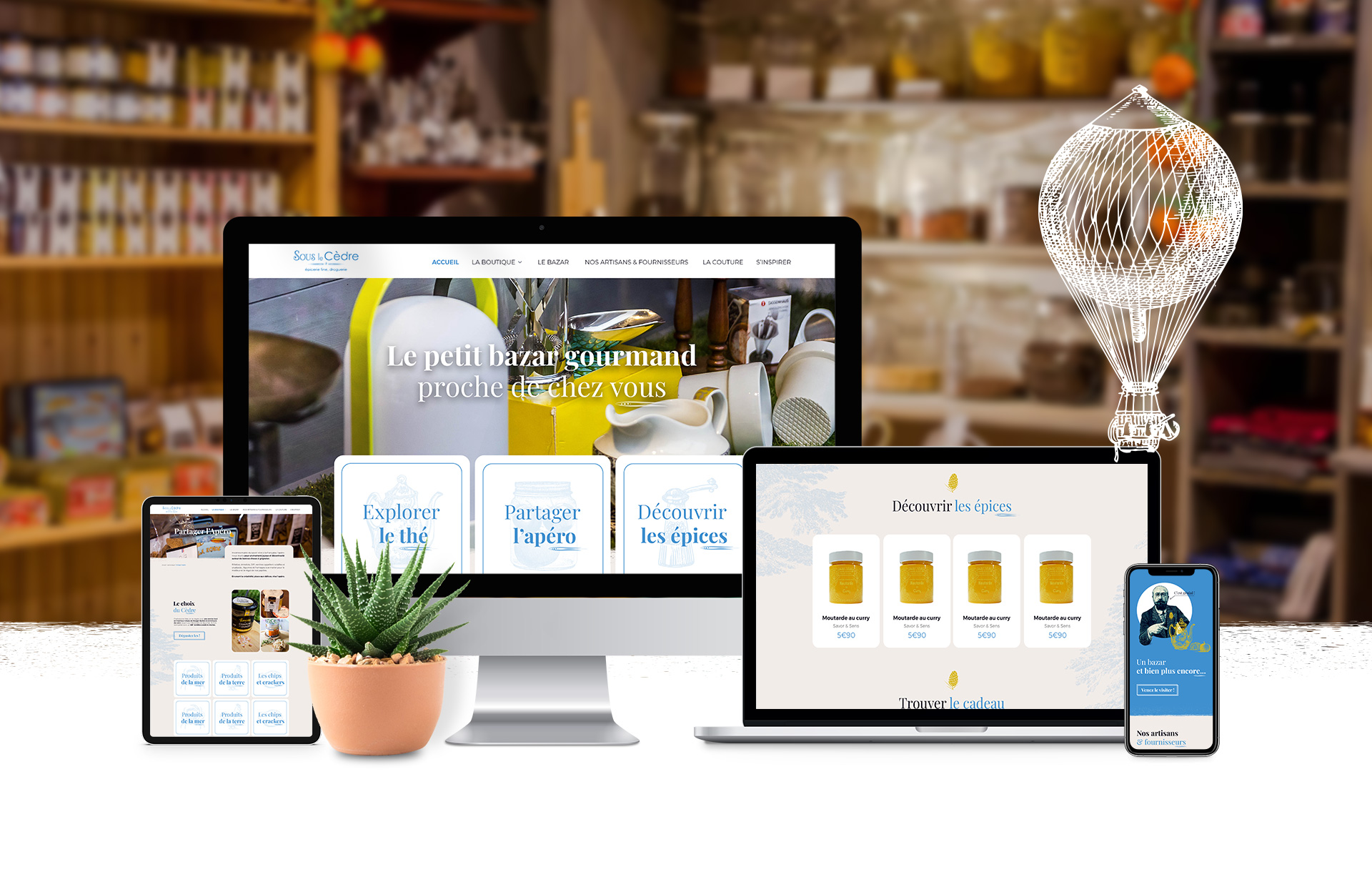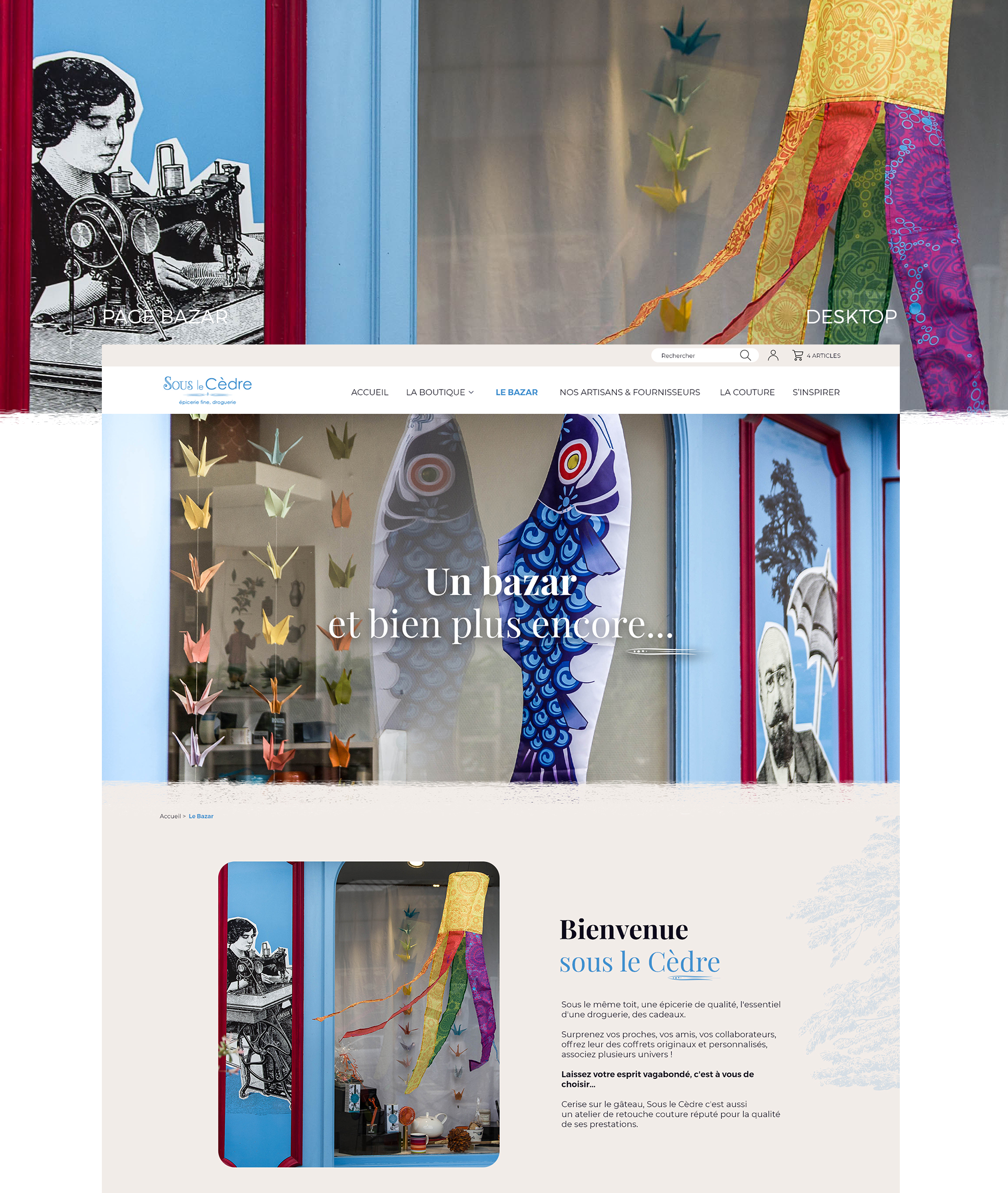 Quand on rentre dans la boutique Sous le cèdre, on se retrouve dans une ambiance cosy, intimiste…mais surtout très originale ! Cette boutique est à la fois un bazar où l’on aime chiner les dernières trouvailles de la propriétaires, une épicerie fine regroupant de nombreux produits de qualités… mais c’est également un atelier de couture qui réalise de nombreuses commandes pour sa clientèle. Claire, sa gérante, a décidé après plusieurs années d’activité, d’étendre sa clientèle en se lançant dans le e-commerce. Pour cela, elle a souhaité que son site soit une extension naturelle de sa boutique physique. Il a donc fallu réfléchir à la meilleure façon de faire coexister ces différentes prestations en un seul site internet.
