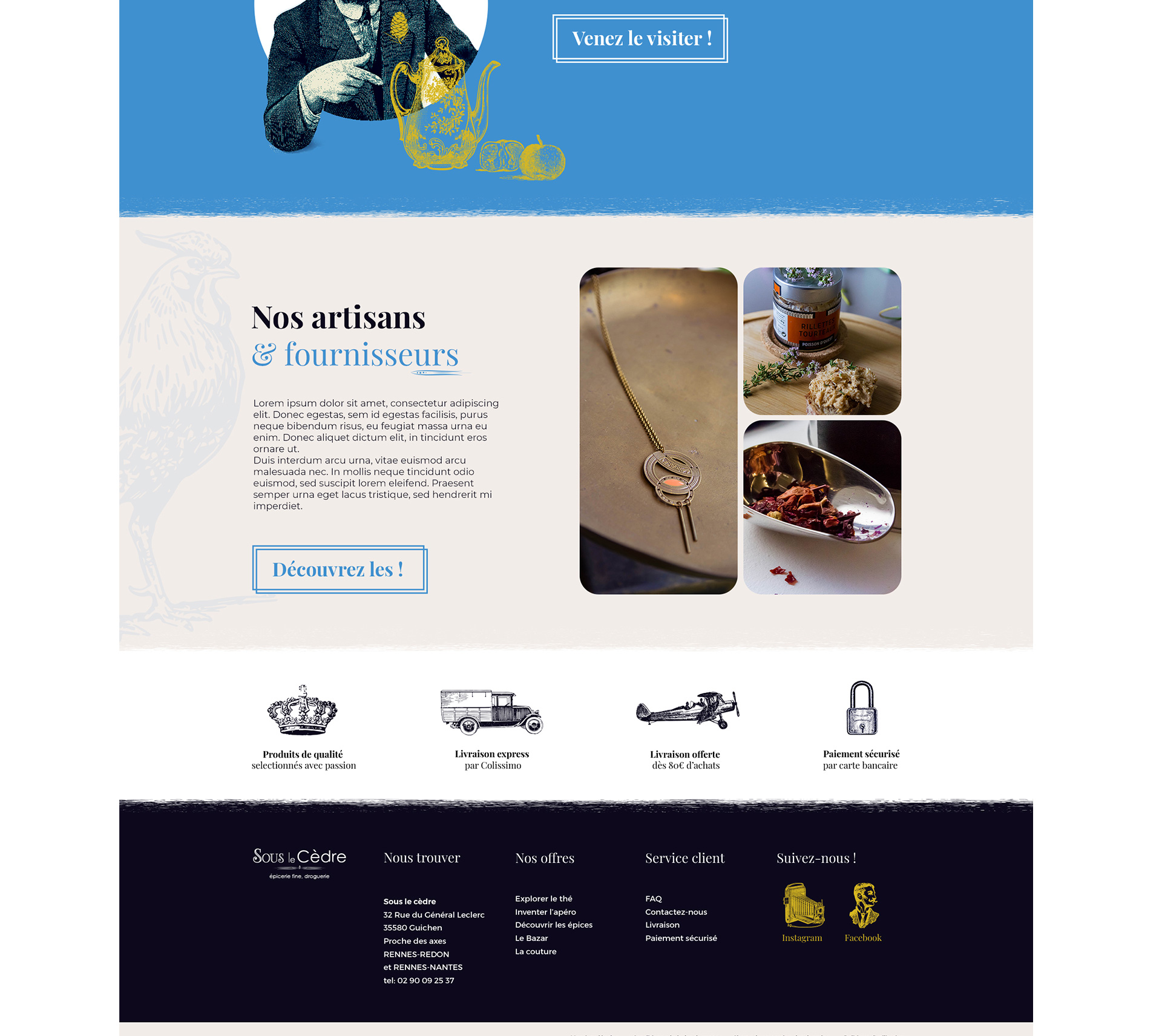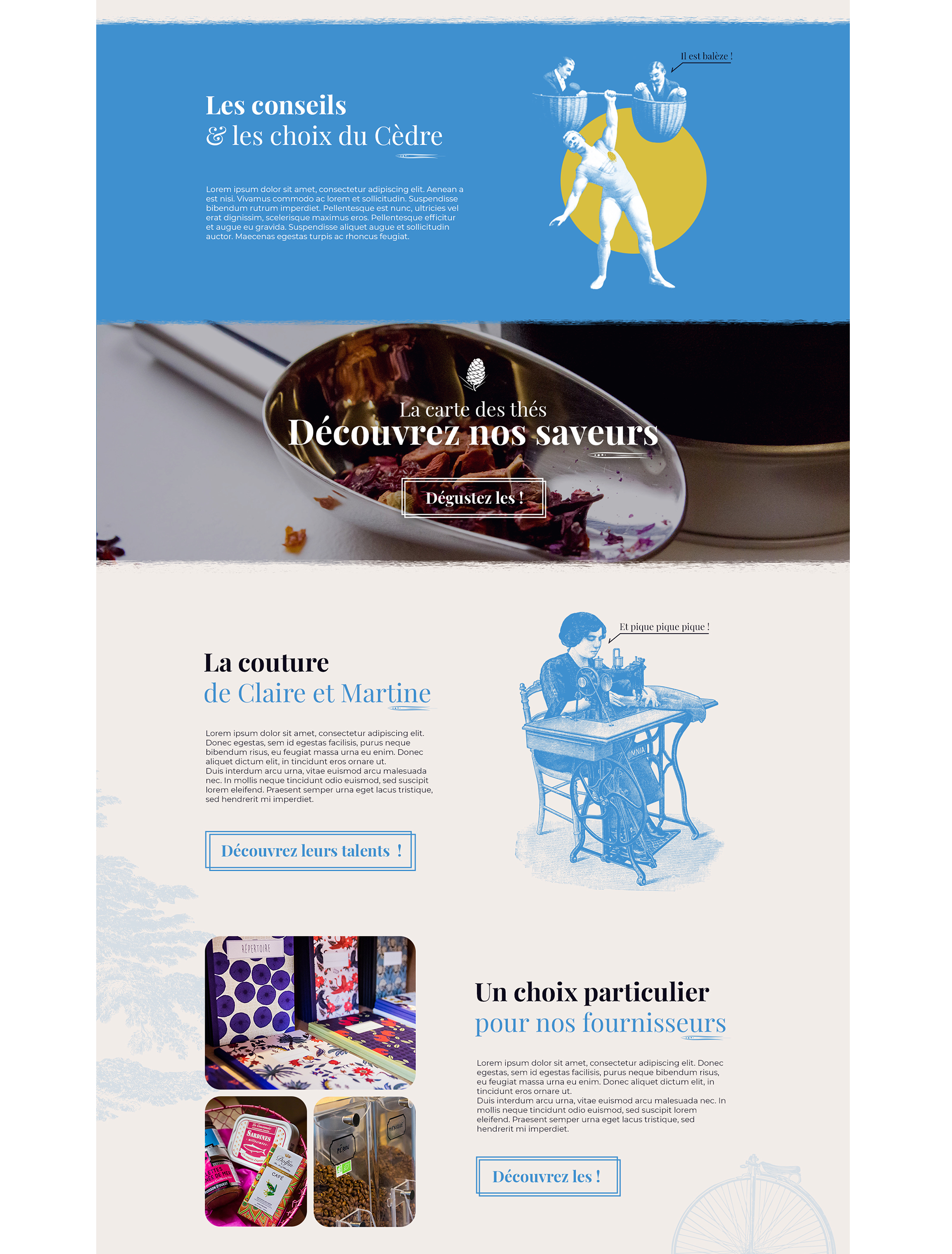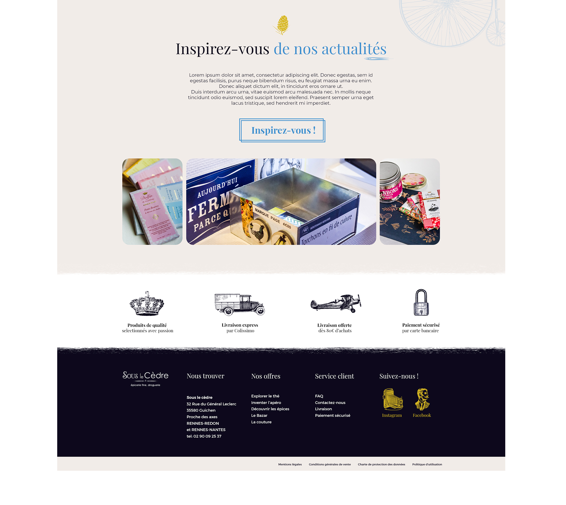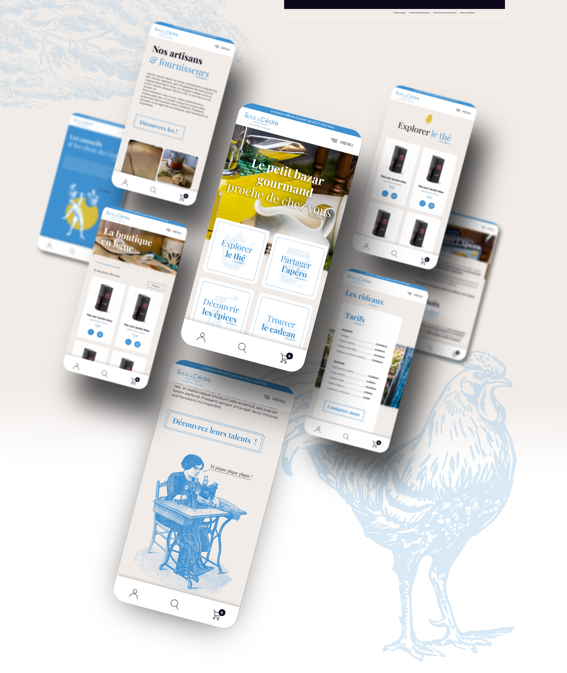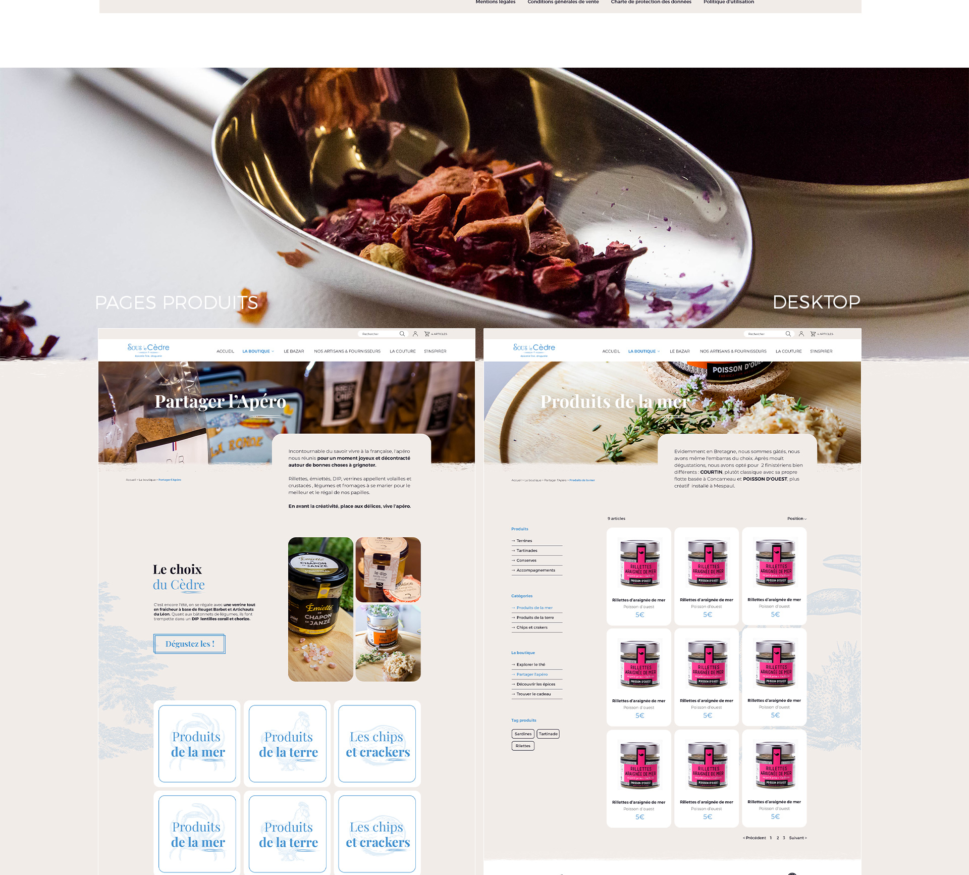 Quand on rentre dans la boutique Sous le cèdre, on se retrouve dans une ambiance cosy, intimiste…mais surtout très originale ! Cette boutique est à la fois un bazar où l’on aime chiner les dernières trouvailles de la propriétaires, une épicerie fine regroupant de nombreux produits de qualités… mais c’est également un atelier de couture qui réalise de nombreuses commandes pour sa clientèle. Claire, sa gérante, a décidé après plusieurs années d’activité, d’étendre sa clientèle en se lançant dans le e-commerce. Pour cela, elle a souhaité que son site soit une extension naturelle de sa boutique physique. Il a donc fallu réfléchir à la meilleure façon de faire coexister ces différentes prestations en un seul site internet.