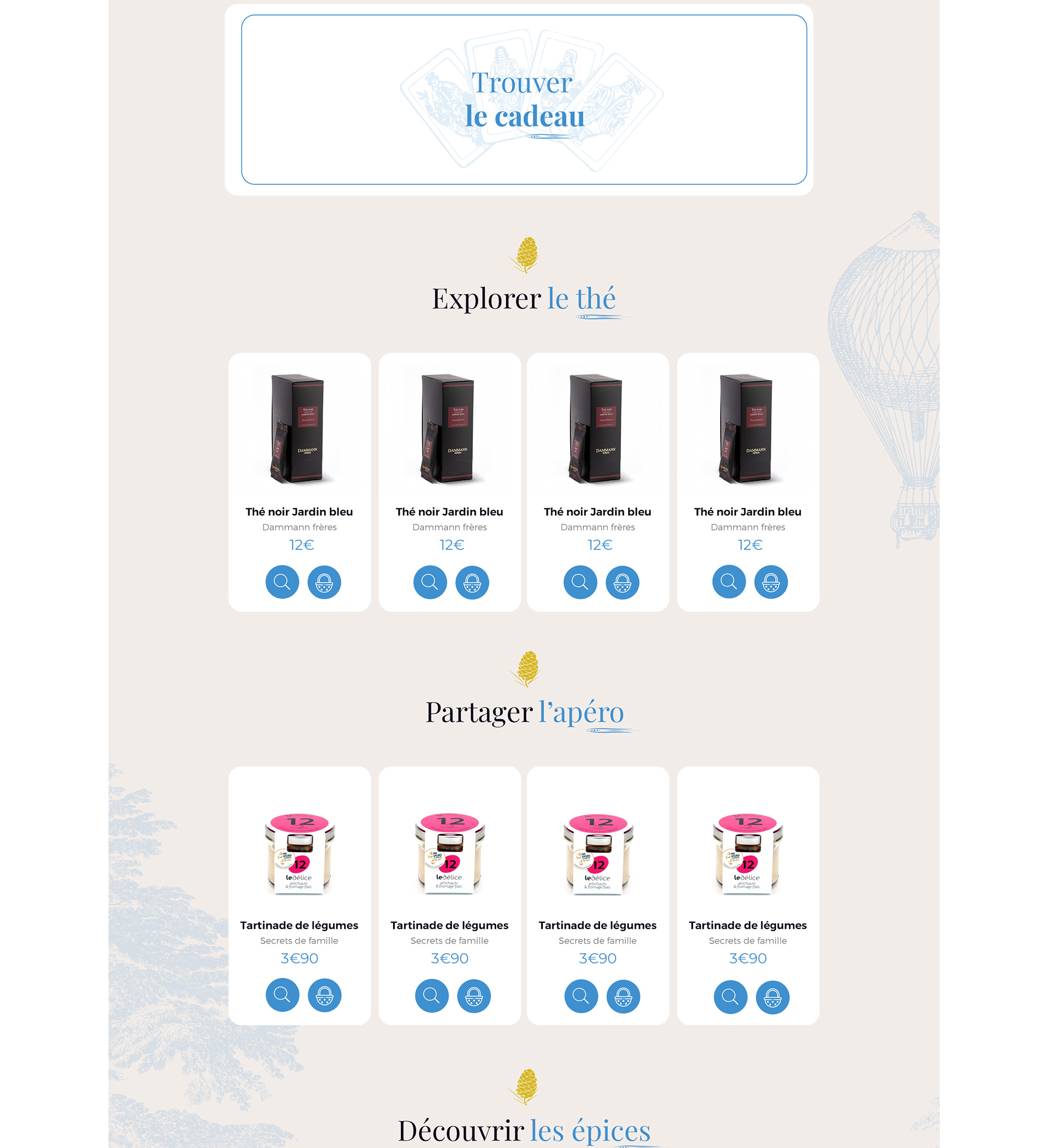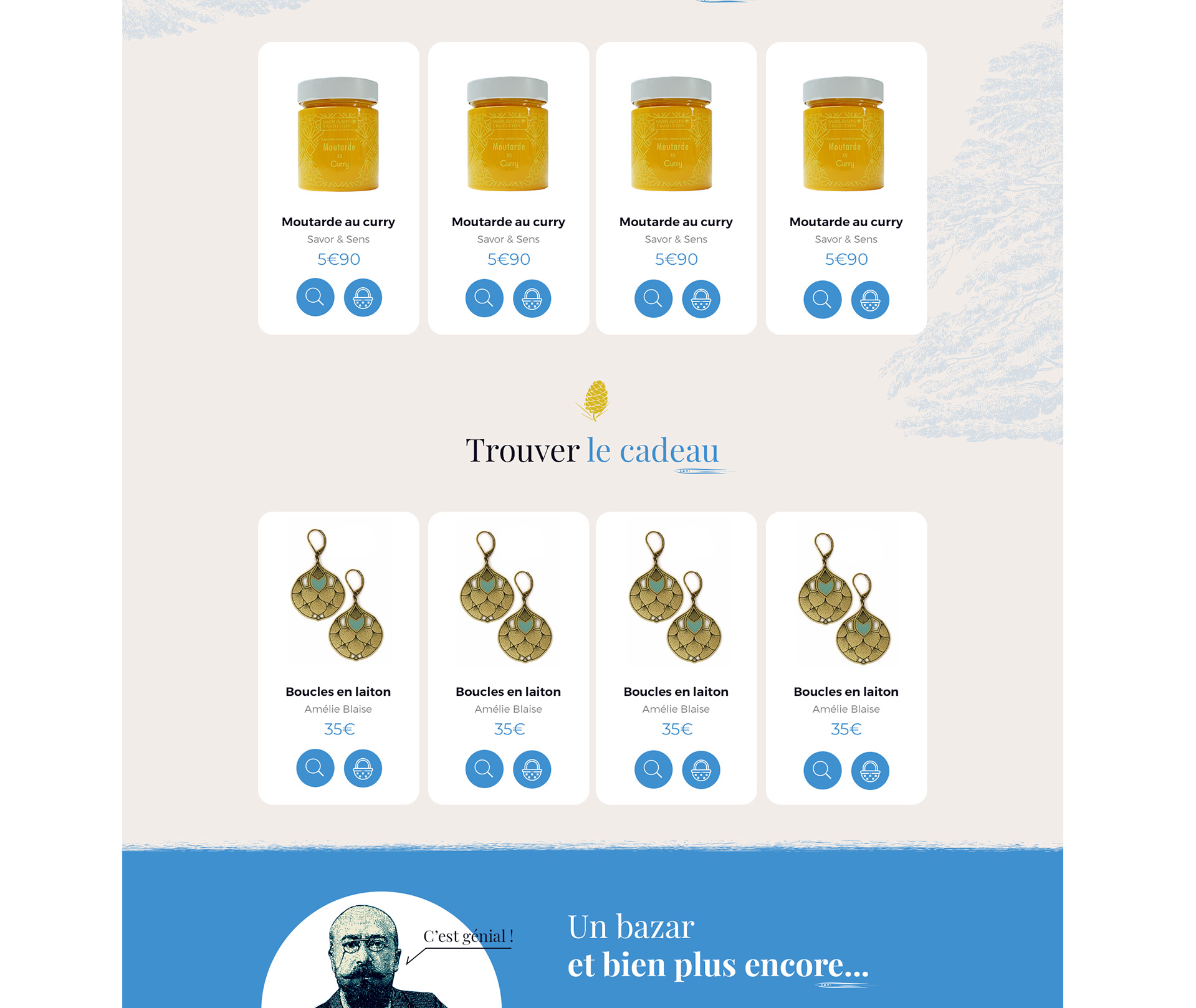 Avant de penser à l’aspect graphique, un vrai travail d’ergonomie a été réalisé en amont. Après plusieurs rendez-vous avec Claire afin de comprendre son fonctionnement et ses besoins, nous avons réfléchis à un parcours utilisateur efficace, permettant à la fois un achat en ligne, mais également une découverte de la boutique physique via une partie éditoriale intégrée au site. Le back office a également été réfléchis afin que Claire, qui est avant tout commerçante, puisse utiliser son site de manière simple et rapide. Pour cela, nous avons réalisé des templates de pages personnalisés afin qu’elle puisse en créer de nouvelles rapidement, et mettre à jour les existantes très simplement.