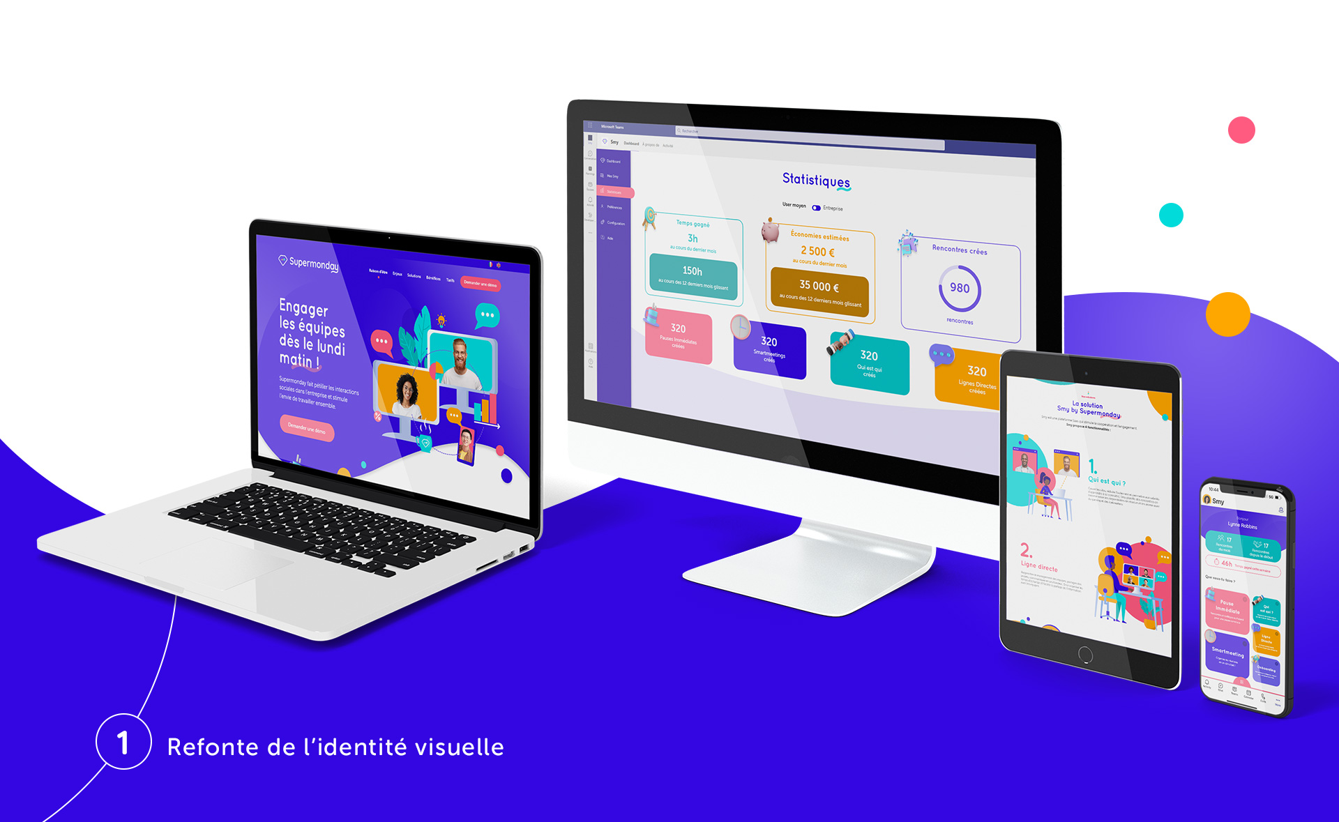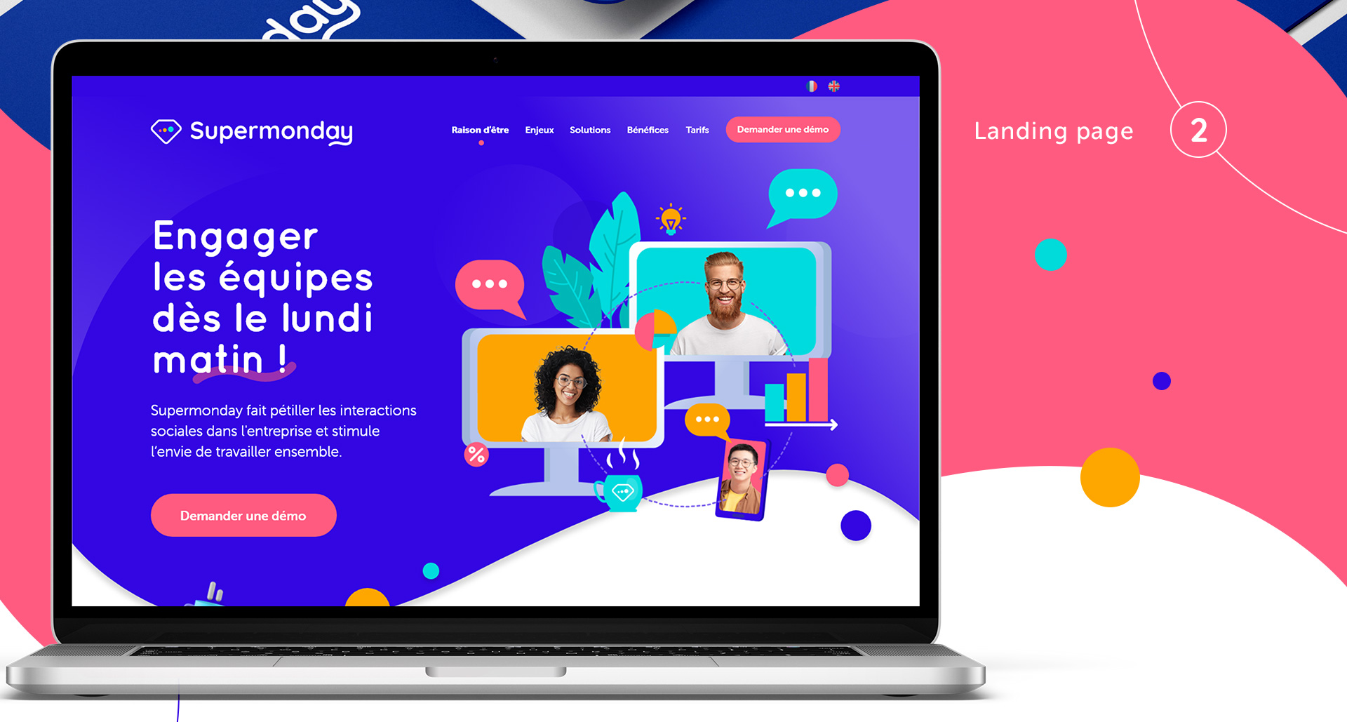 Supermonday est une jeune start up spécialisée dans la création d’applications SAAS. Son objectif est de faire pétiller les interactions sociales dans l’entreprise en stimulant l’envie de travailler ensemble… et cela doit se ressentir dans son identité visuelle ! Ses fondateurs ont donc fait appel à mes services afin d’aligner leur identité de marque à leurs valeurs. Le logo a été retravaillé afin d’être plus représentatif de la marque, de par ses couleurs joyeuses et modernes, et ses formes plus arrondies. L’utilisation d’illustrations hautes en couleurs, mêlées à des images de collaborateurs, renforce l’aspect ludique et fédérateur de l’entreprise ainsi que de ses solutions. Après une refonte totale de leur charte graphique, nous avons travaillé ensemble sur la création de leur landing page responsive. Celle-ci ayant pour but de communiquer sur leur application SAAS, SMY.