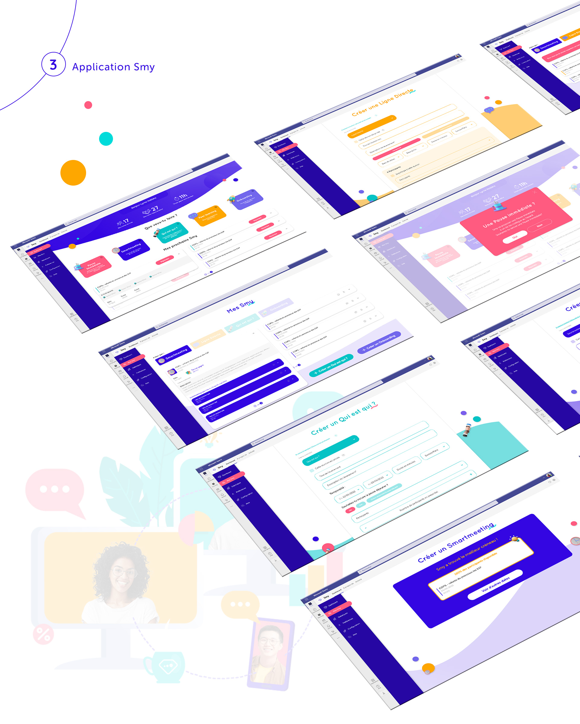 Smy est une plateforme Saas qui stimule la coopération et l’engagement. Elle permet de créer du lien entre les collaborateurs et les dirigeants, de gérer facilement des meetings, ou encore de faciliter les rencontres par des pauses aléatoires entre les différents services. Cette application s’intègre directement dans le Teams de l’entreprise. Afin de rendre l’application plus ergonomique et plus attractive, SUPERMONDAY a fait appel à mes services afin de refondre leur solution. Un gros travail d’UX et d’UI nous a permis de réaliser ensemble une application fonctionnelle, simple d’utilisation et surtout ludique.